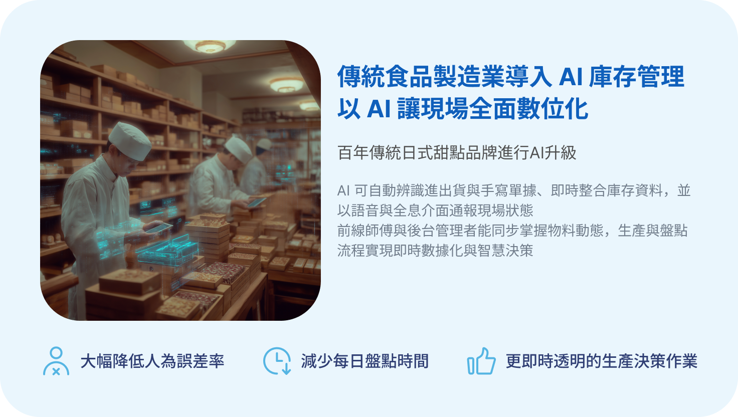 即時監控原料與產能數據,透過AI預測需求波動,優化庫存週轉率,降低呆料與倉儲成本